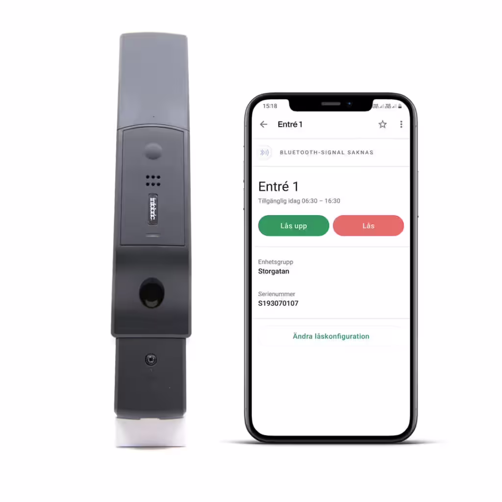 Elektroniskt och mobilt dörrlås som enkelt monteras vid porten utan åverkan och öppnas med app. Perfekt för tillfälliga renoveringsprojekt i fastigheter.