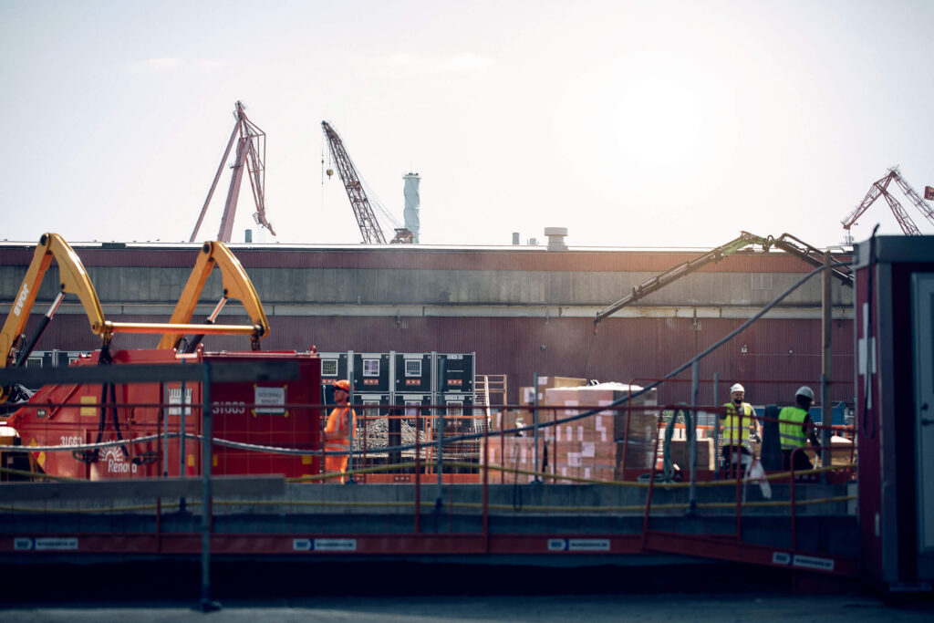 byggarbetare i förgrunden och byggarbetsplats i fokus i bakgrunden.