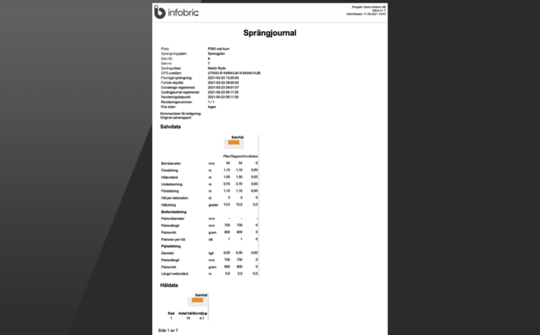 Skapa en sprängjournal med faktiska data.  Få enkelt med alla värden och beräkningar samt din företagslogotyp i rapporten. Du utgår från din Salvdesign och gör enkelt de ändringar som till exempel har skett efter borrningsarbetet eller justeringar i vilka produkter som använts.