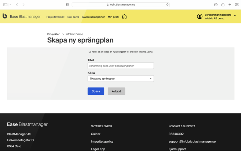 Infobric Blastmanager gör det både säkrare och enklare att spränga och sparar tid för alla parter. Du kommer åt den digitala tjänsten vi valfri uppkopplad enhet och får hjälp med allt från planering och riskanalys till beräkning av sprängämnen och dokumentation.