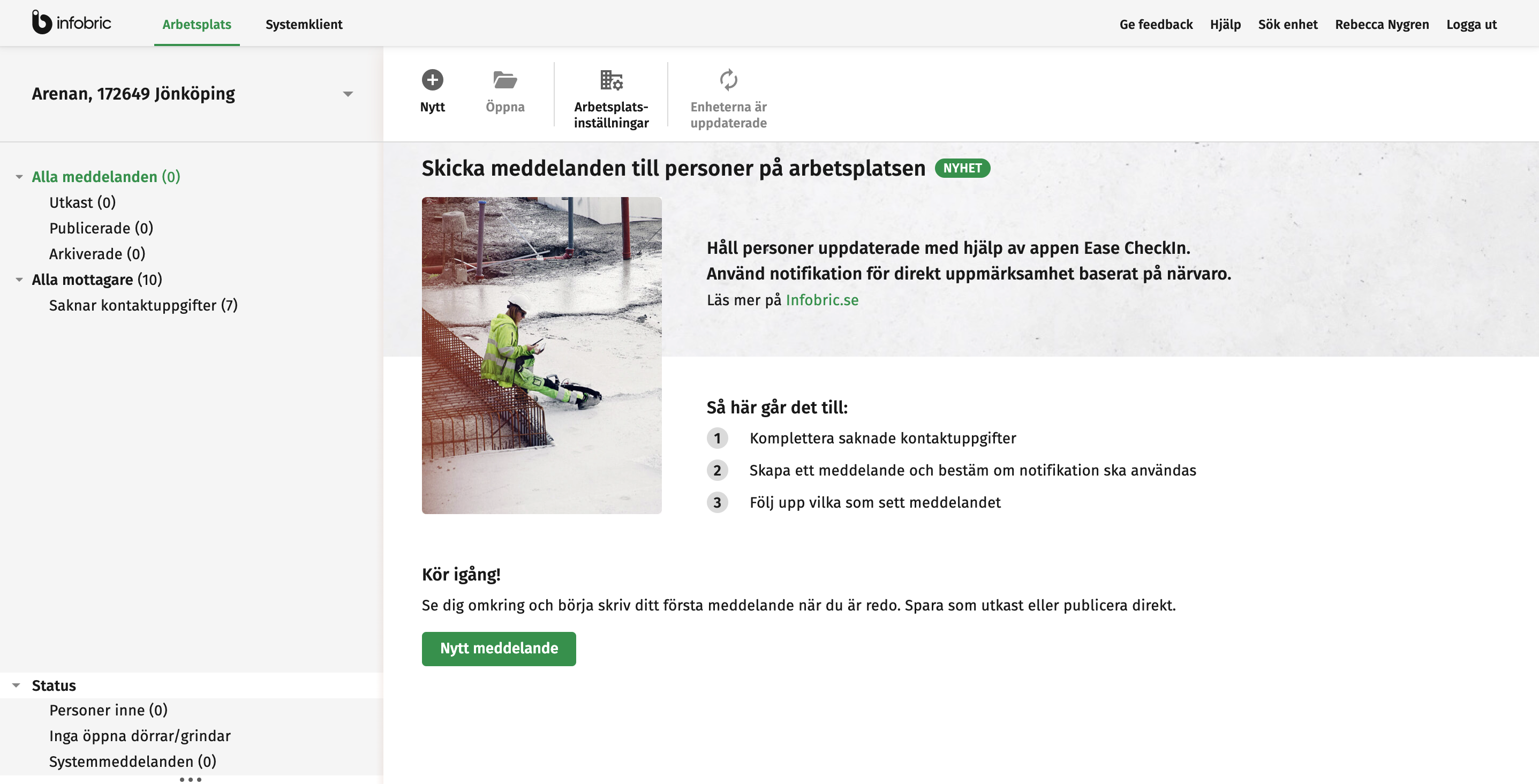 Vi gör det nu möjligt för platsadministratörer att genom Infobric Site skicka meddelanden till personer på arbetsplatsen med appen Ease CheckIn. Sprid viktig information snabbt och se till att alla som är närvarande på arbetsplatsen notifieras direkt. Oavsett om du snabbt behöver meddela alla på arbetsplatsen om en brand eller annan fara eller bara vill nå ut med information att det bjuds på tårta, är vår nya meddelandefunktion perfekt för att se till att alla nås av samma information – samtidigt.