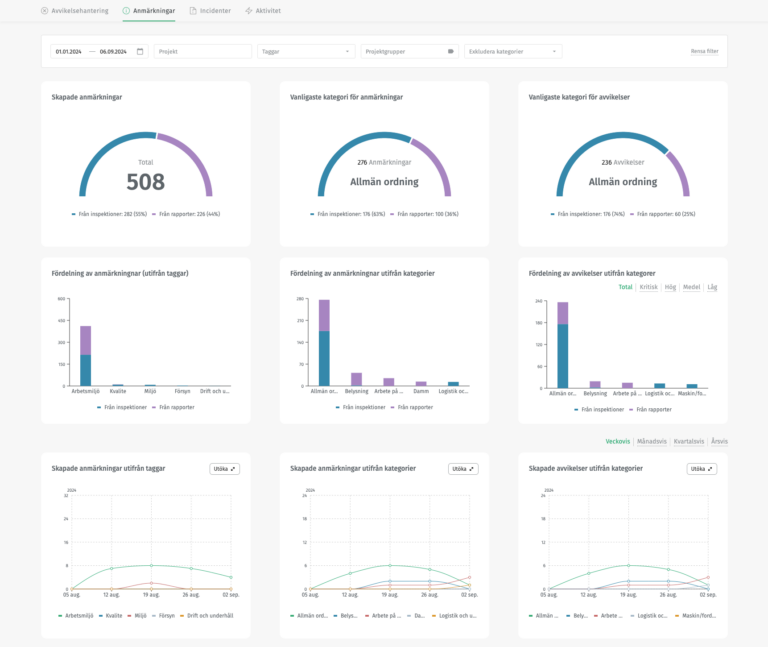 Infobric Field samlar all KMA-rapportering i ett och samma system. Observationer, incidenter, kontroller och åtgärder rapporteras direkt i mobilen och visualiseras automatiskt i dashboards med status, trender och nyckeltal. Det gör det enkelt att följa upp arbetet per projekt eller centralt – och att snabbt se var insatser behövs.