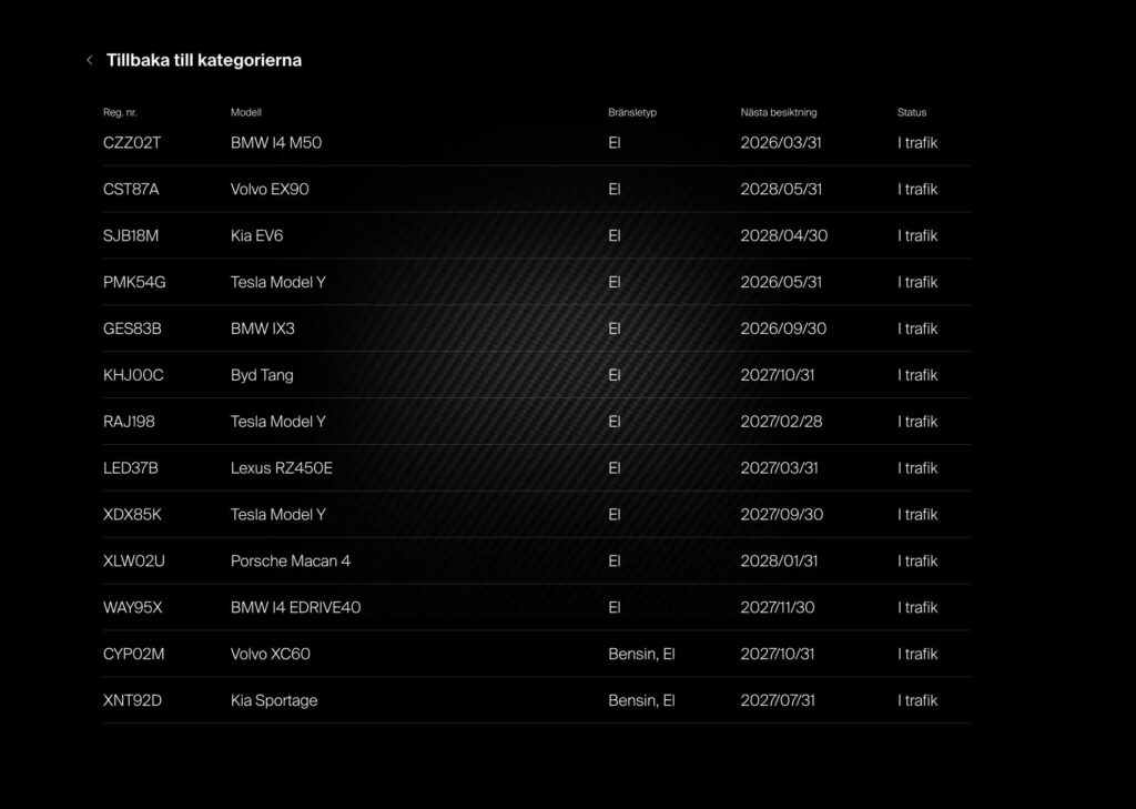 Du får direkt koll på hur många förmåns- och företagsbilar ni har, vilket drivmedel de kör på, aktuell status och när nästa besiktning väntar.