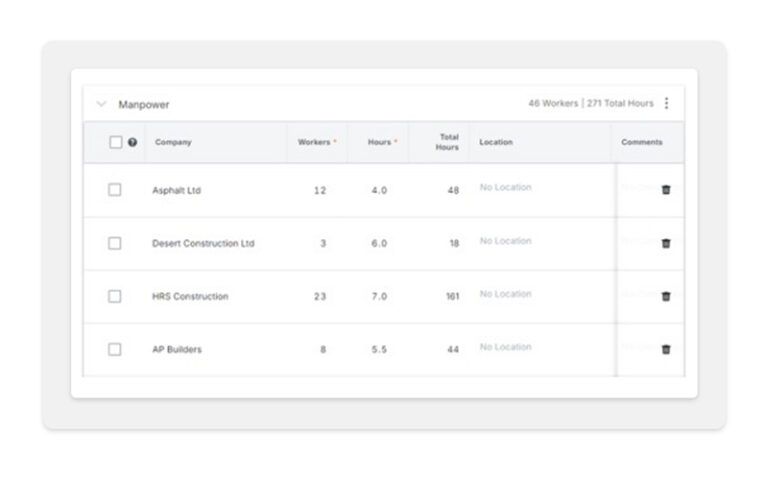 Similarly, the data can be viewed in Procore’s Site Diary and Daily Log tool as company Manpower summaries if preferred, or as well as.